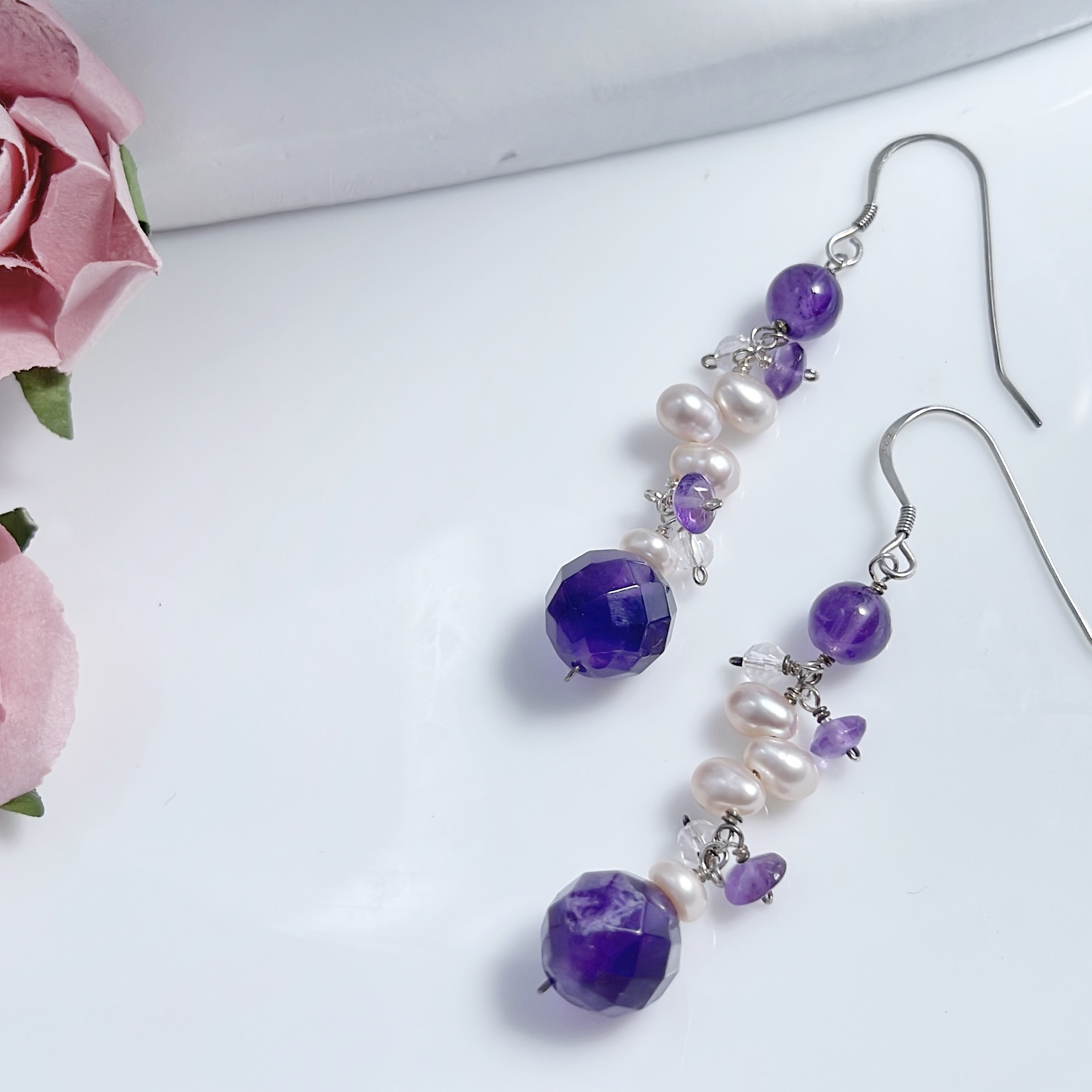 Silver925 手工製 天然紫水晶 珍珠復古耳釘
